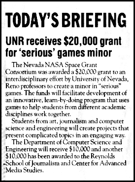 Student games produced under my tutelage were awarded with in national and international competitions. The minor was funded by a grant by the Nevada NASA Space Grant Consortium.